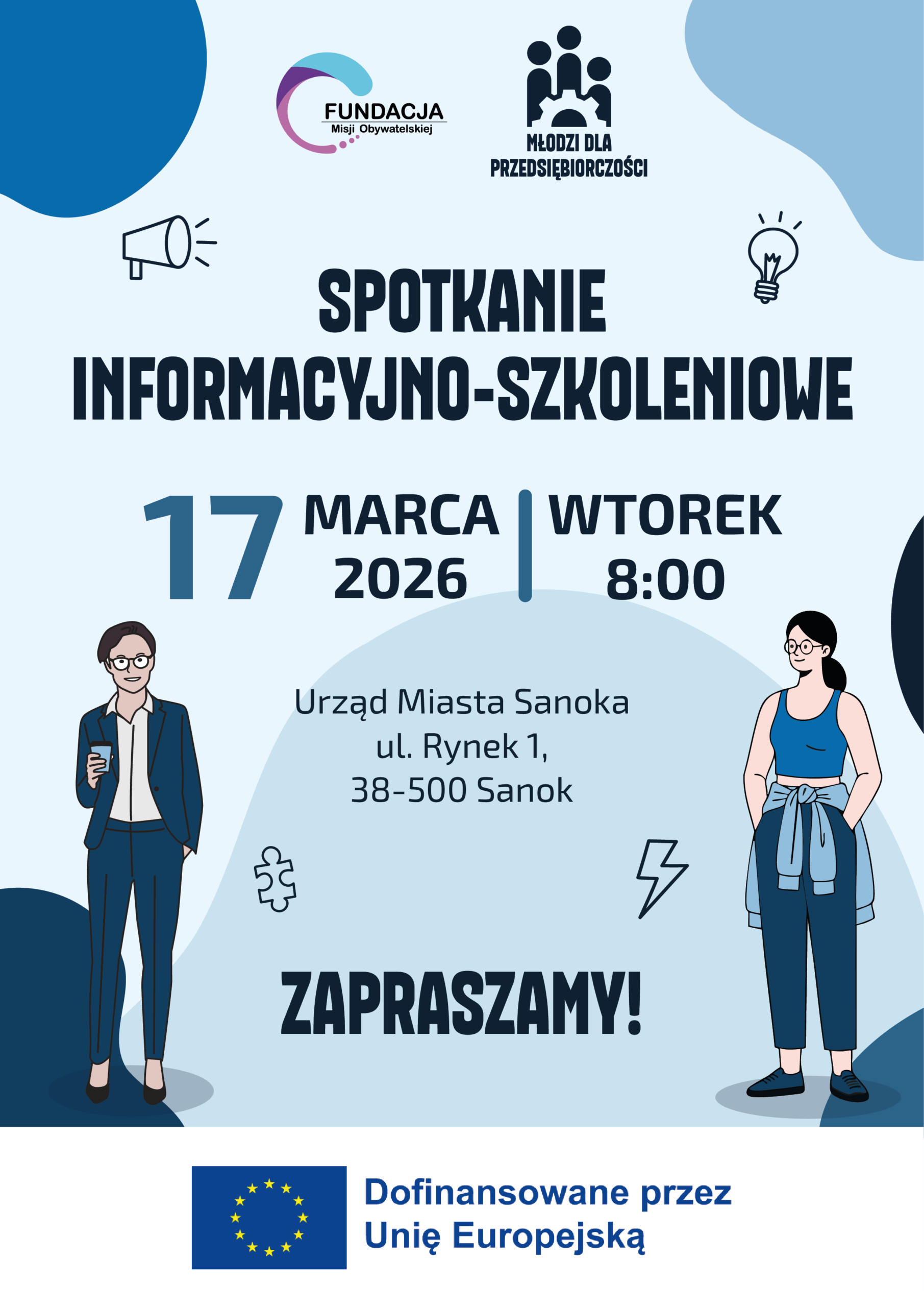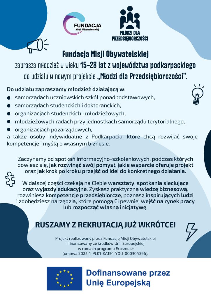 Fundacja Misji Obywatelskiej zaprasza młodzież z powiatu sanockiego na spotkanie informacyjno-szkoleniowe realizowane w ramach projektu „Młodzi dla Przedsiębiorczości”, finansowanego ze środków Unii Europejskiej. Wydarzenie odbędzie się 17.03.26 r. o godz. 08:00 w Urzędzie Miasta w Sanoku (ul. Rynek 1, 38-500 Sanok).