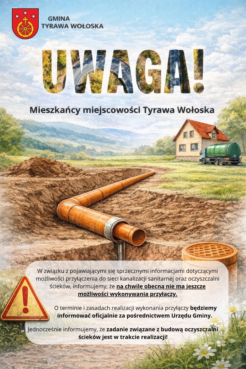 W związku z pojawiającymi się sprzecznymi informacjami dotyczącymi możliwości przyłączenia do sieci kanalizacji sanitarnej oraz oczyszczalni ścieków, informujemy, że na chwilę obecną nie ma jeszcze możliwości wykonywania przyłączy.